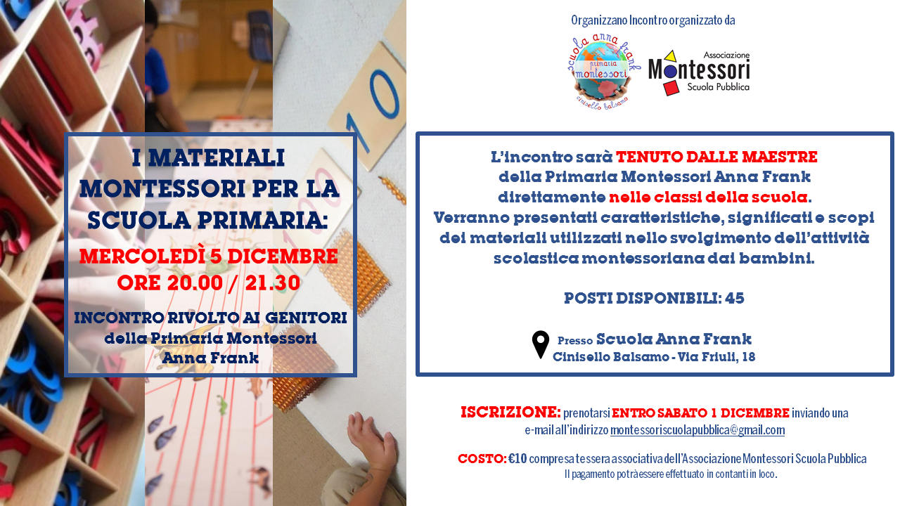 Gli insegnanti e i genitori della scuola Primaria Montessori Anna Frank di Cinisello, in collaborazione con Montessori Scuola Pubblica organizzano l’incontro:
