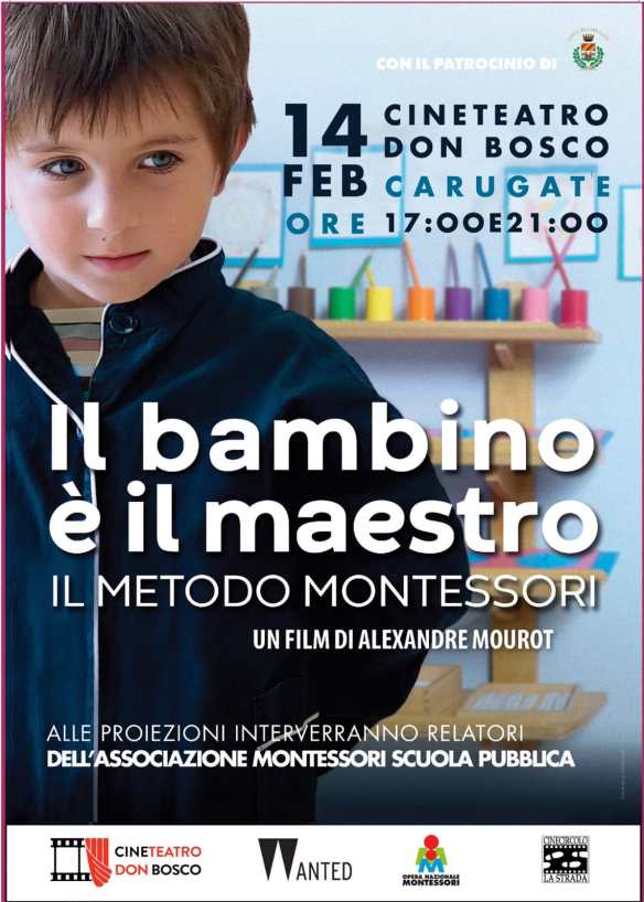 L’ Associazione Montessori Scuola Pubblica ha il piacere di invitarvi alle due proiezioni del film “Il Bambino è il Maestro” di Alexandre Murot, il 14 febbraio alle ore 17,00 e alle ore 21.00 presso il CineTeatro Don Bosco in Via Pio XI, 34, a Carugate (MI)