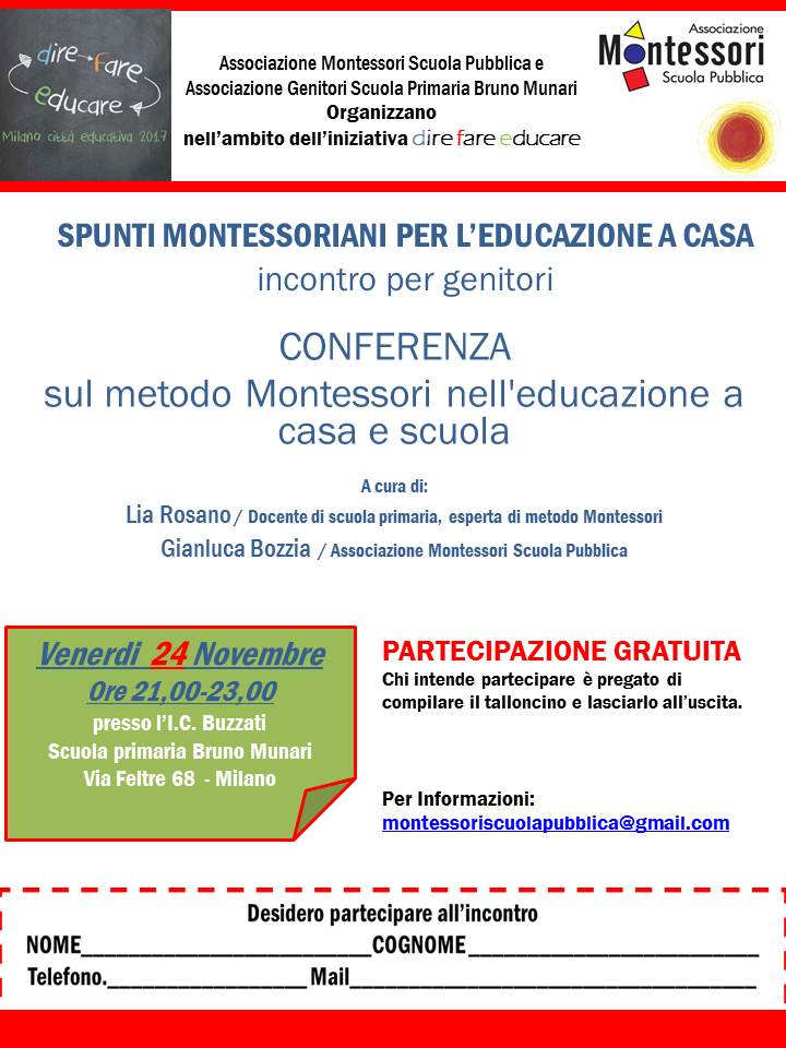 L’Associazione Montessori Scuola Pubblica, quale partner del Comune di Milano nell’ambito del progetto “Dire, fare, educare”, organizzerà dal 21 al 24 novembre 2017 alcune iniziative, a titolo gratuito, sul tema dell’innovazione didattica e pedagogica.